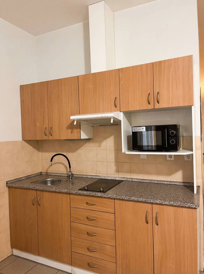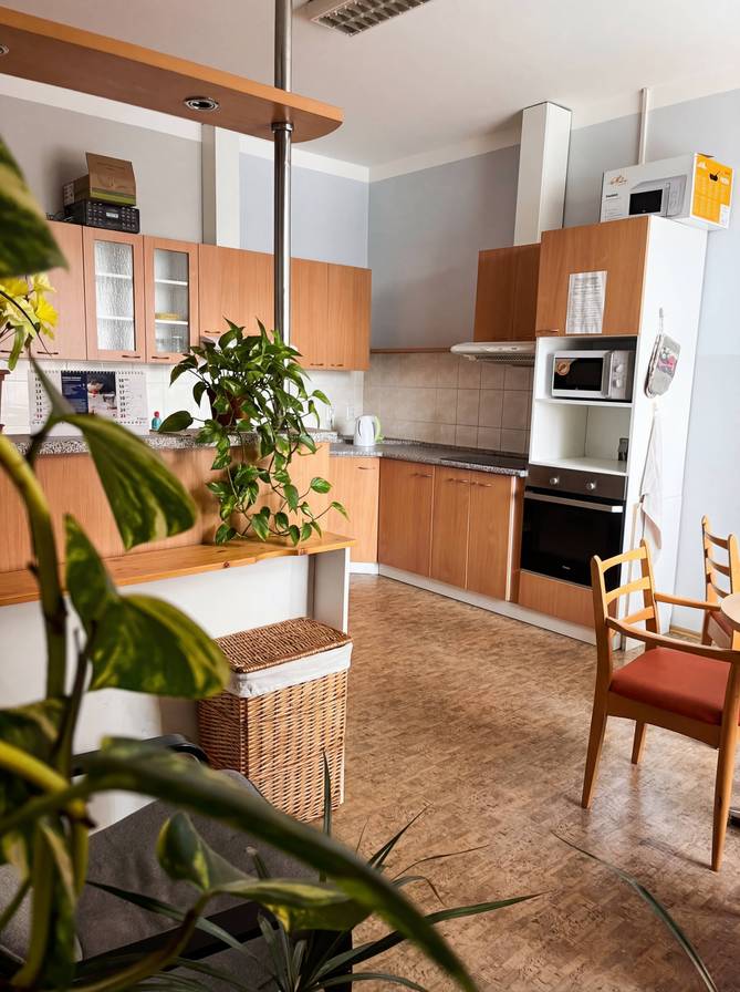 - Kuchyňka s vybavením: (varná deska, mikrovlnná trouba, varná konvice, jídelní stůl, židle)